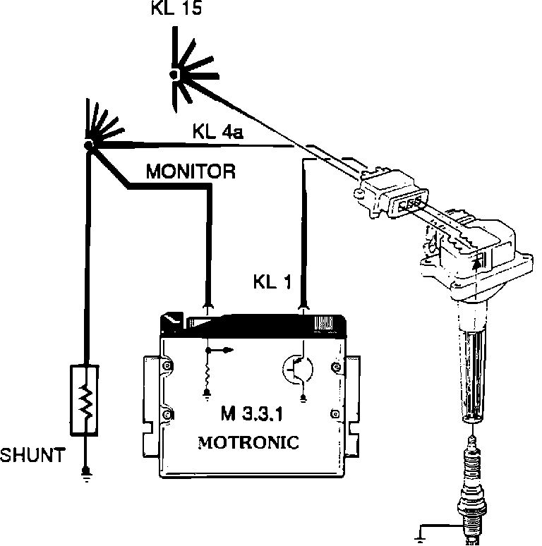 Monitoring detects misfires on a cylinder-selective basis via a shunt (240 ohm resistor), and monitoring circuit in the DME control module. If the primary ignition circuit monitoring is recognized as OK, but secondary ignition voltage is not reached, the coresponding fuel injector output stage is switched off.