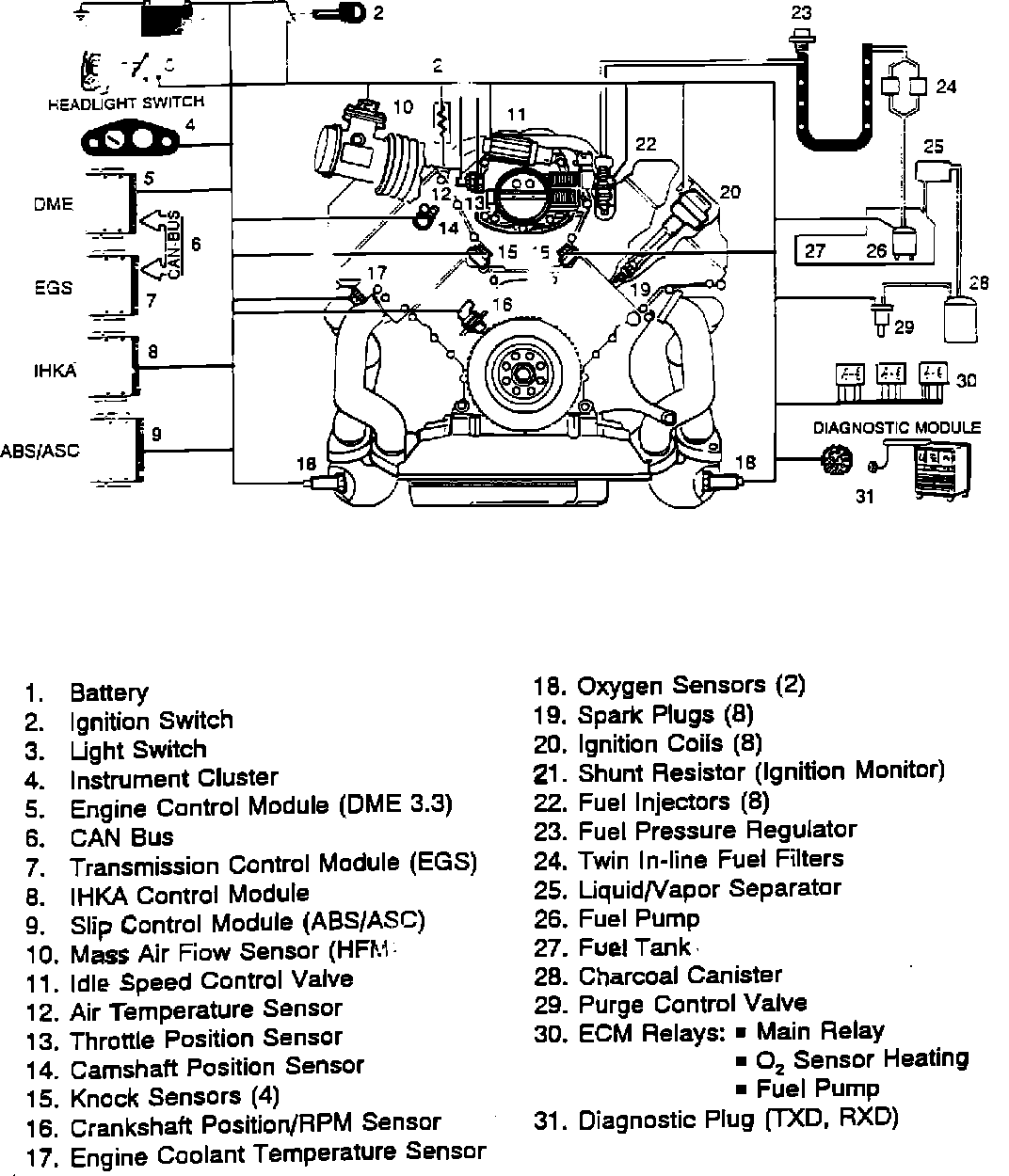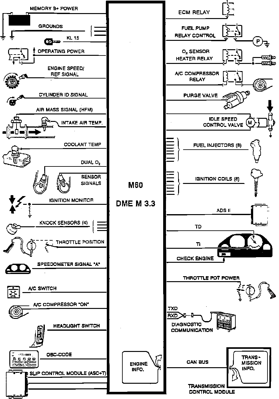The Digital Motor Electronic (DME) control module (3.3.) provides precise control of fuel injection and ignition systems to ensure optimum performance and strict emissions compliance. Various engine sensors and other systems (i.e.. air conditioning, auto transmission etc.) supply the DME control unit with operating information. The DME control unit processes the sensor input and sends output signals to adjust injector pulse width, injector timing, and ignition timing.