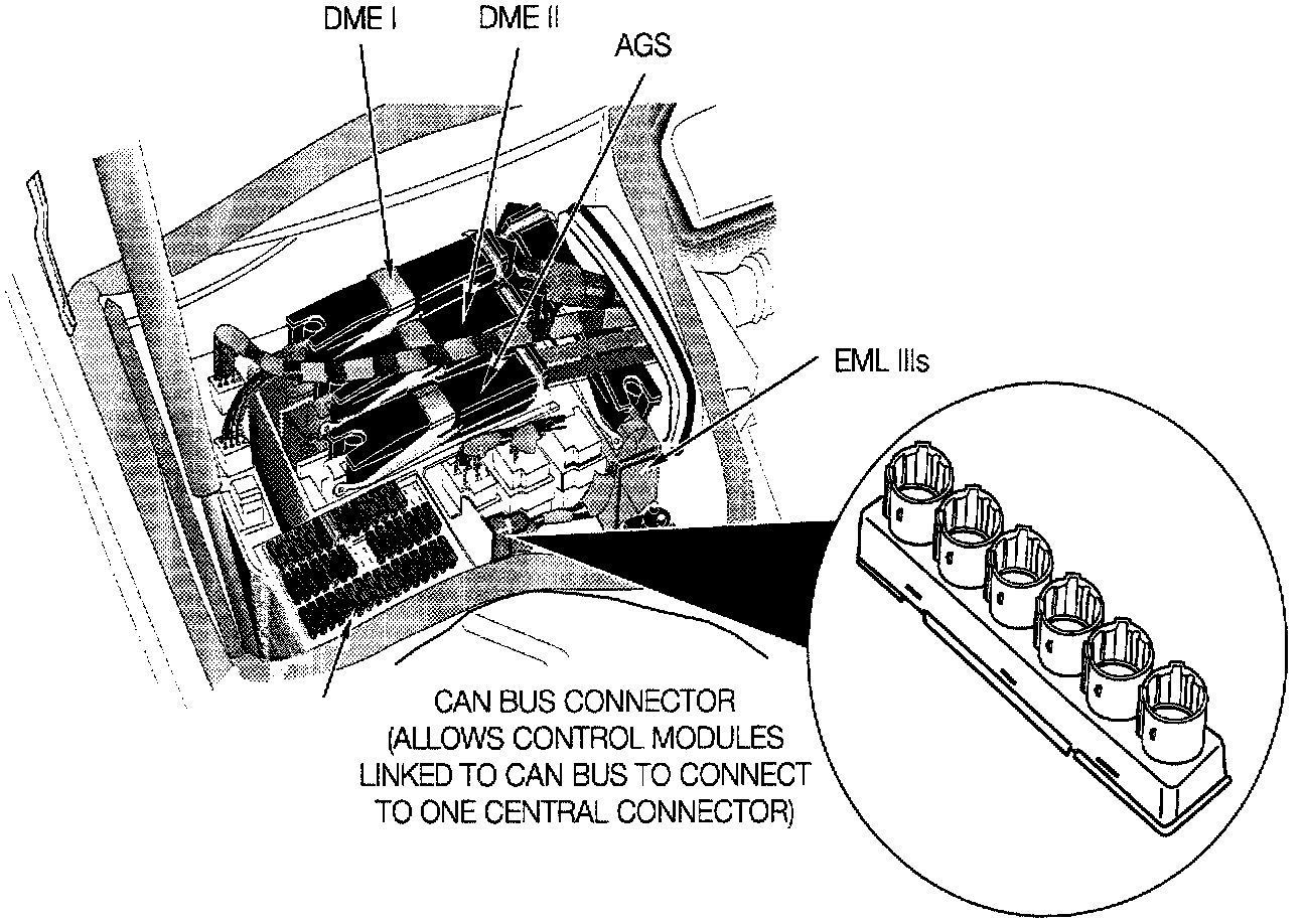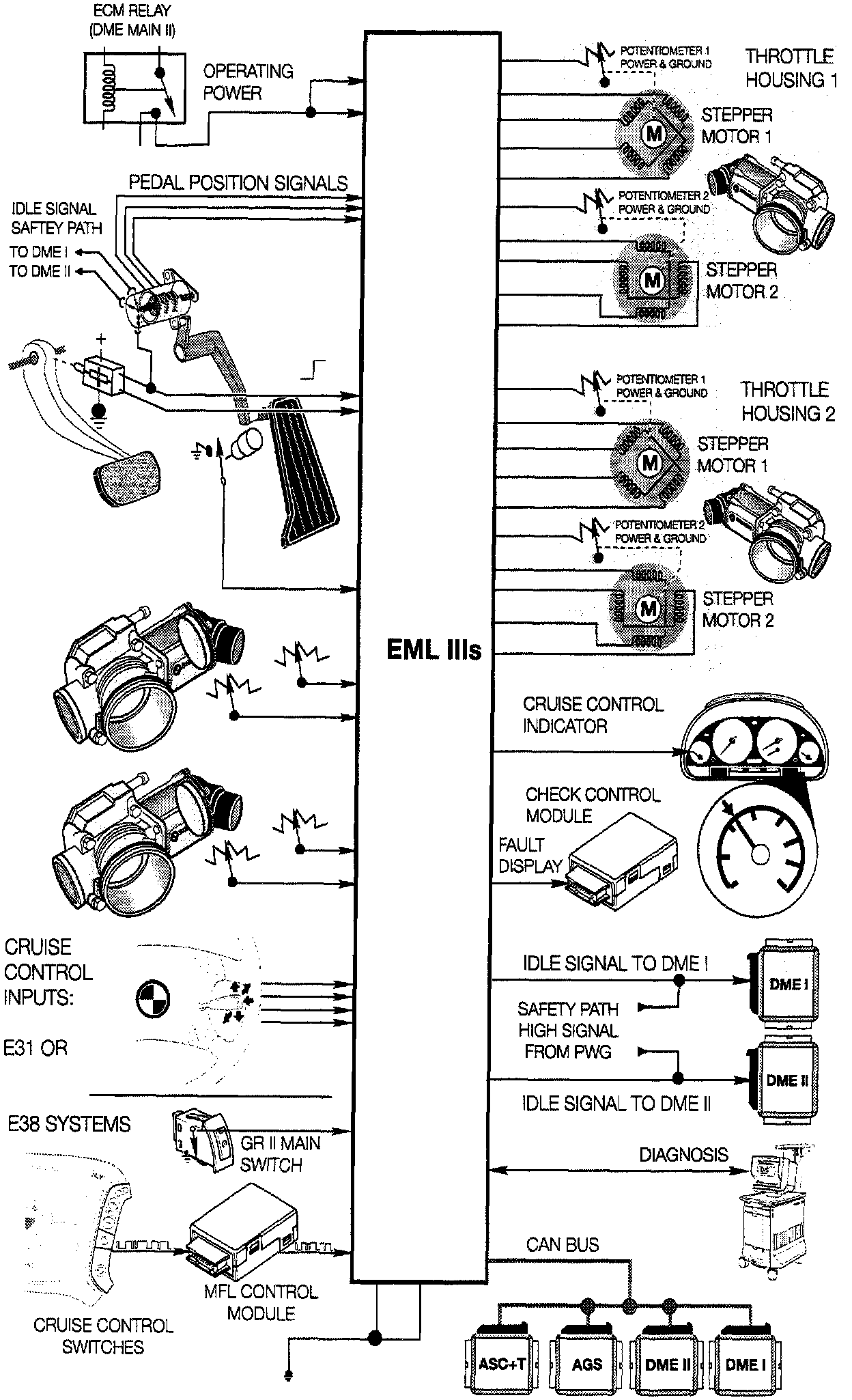 The EML control module communicates with the DME ASC+T and EGS control modules over the CAN line for the following inputs/outputs: