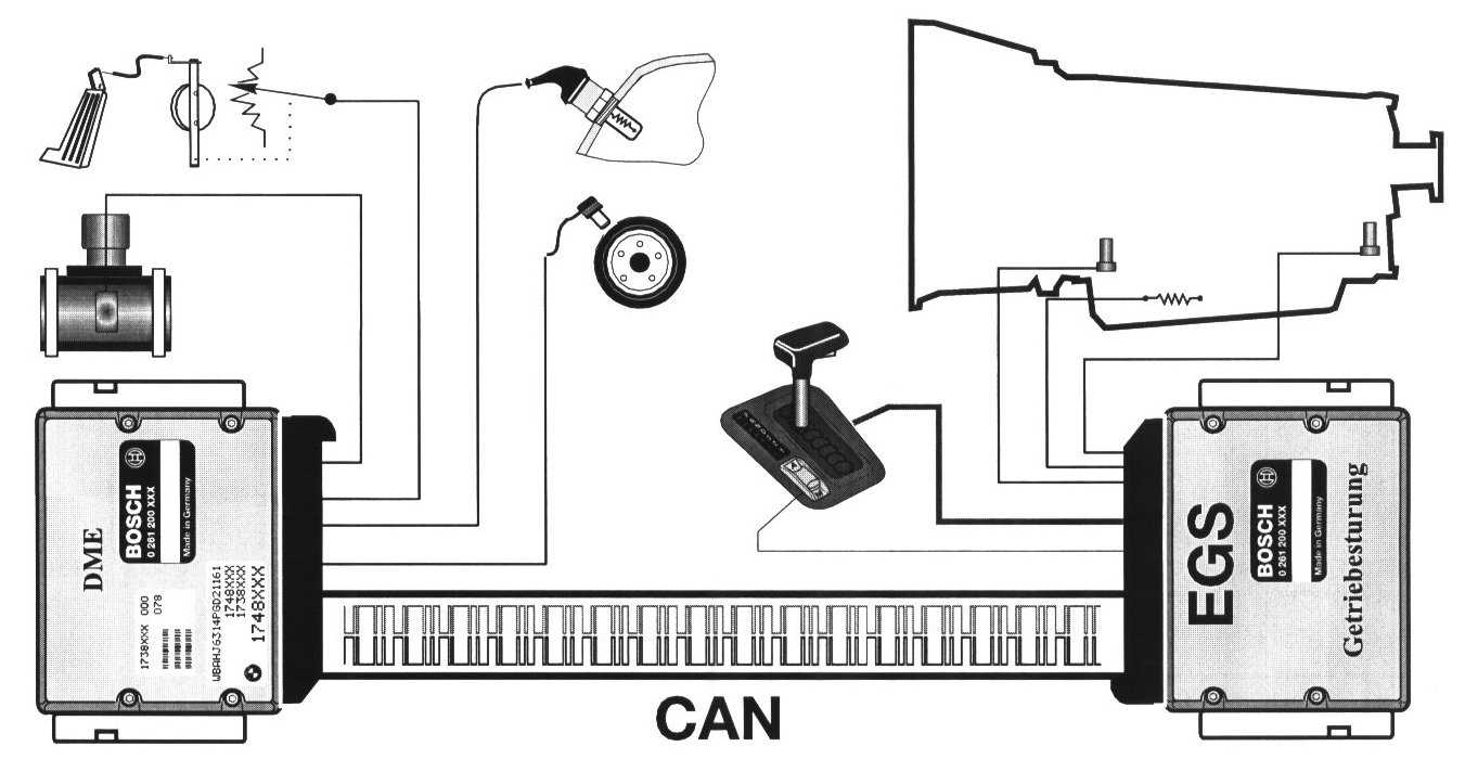 CAN was introduced on BMW vehicles starting with the 1993 740i/iL with M3.3. The CAN communication signal is considered as an input and an output between the engine and transmission control modules (among others). The CAN supplies the ECM and the EGS with all related operating data required by their operation. The CAN is a high speed bus that transfers one million bits of information per second.