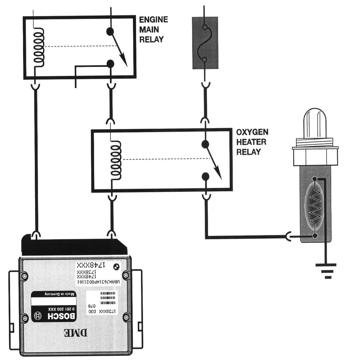 Early engine control Systems (M3.x and previous) provide a ground for the Oxygen Sensor Heater Relay providing power to the heating elements in the sensor(s). The control of the relay is activated after a pre-determined programmed duration of time shortly after engine start up. At VL throttle angle the Engine Control Module switches the relay off