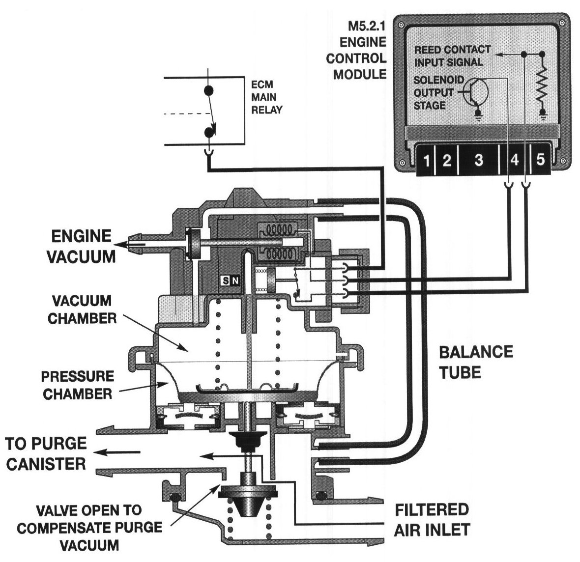 - The repetitive up/down stroke is confirmation to the ECM that the valve is functioning and the basis for determining if a leak is present in the system. The ECM monitors the length of time it takes for the reed switch to open, which is opposed by pressure under the diaphragm in the lower chamber. The LDP is still cycled, but at a frequency that depends upon the rate of pressure loss in the lower chamber.