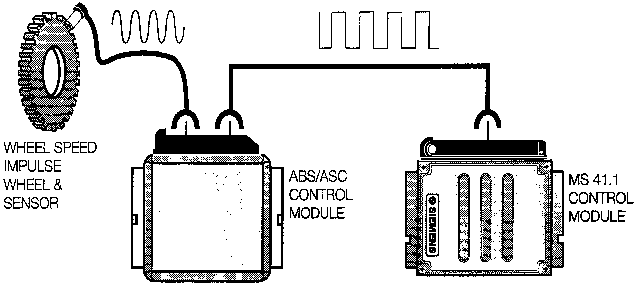 The vehicle speed input signal is provided by the ABS/ASC control module. The wheel speed sensor input is processed by the ABS and made available to the MS41.1 Control Module as a digital square wave signal. The frequency of the signal is proportional to the speed of the vehicle.