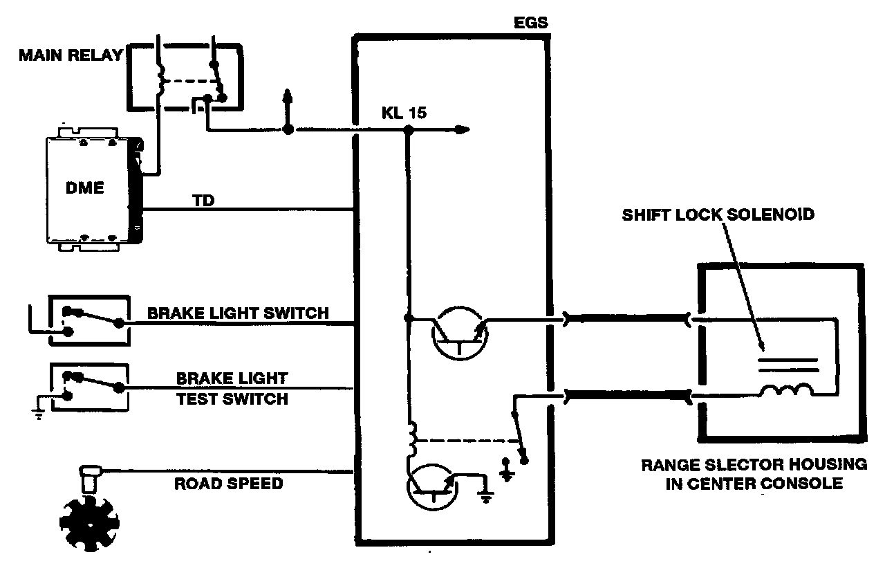 The TCM is programmed to activate the shift lock when TD is present. A brief delay is programmed in the TOM for normal gear selection (ie: while moving the range selector from drive to reverse). The shift lock function is not active if a road speed signal is present or when the transmission is in fail safe.