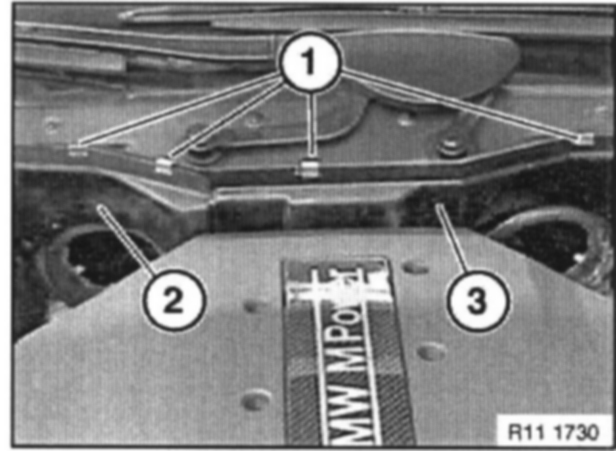 Unclip both cable strips (2), tilt up and tie back (e.g. to engine hood).