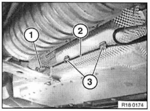 Unclip cable (1) from fixtures (2) on cross-member.