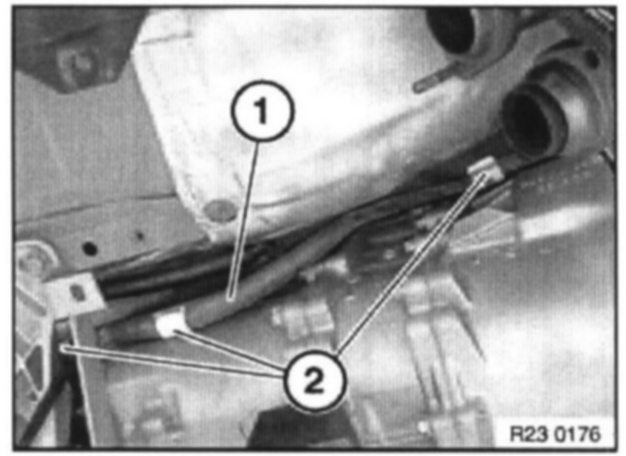 Unclip cable (1) from cable holder (2) on transmission housing.
