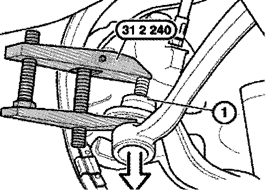 Unscrew left and right nuts. Press left and right track rod off steering knuckle with special tool 31 2 240.