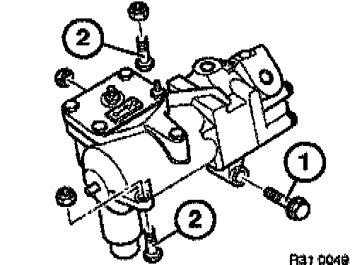 Draw in steering gear on screw (1) until it abuts the front axle support and only tighten hand-tight. First tighten screws (2), then tighten screw (1).