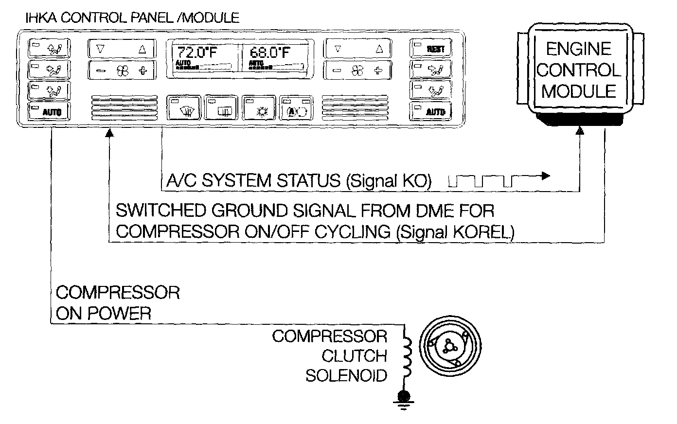 On E38/39 models, the ECM sends a reply (KOREL) signal to the IHKA control module. If input conditions are correct, the IHKA will activate the A/C compressor. In addition this separate signal circuit is used to signal the IHKA to deactivate the compressor in the event that stand still full load conditions are present.