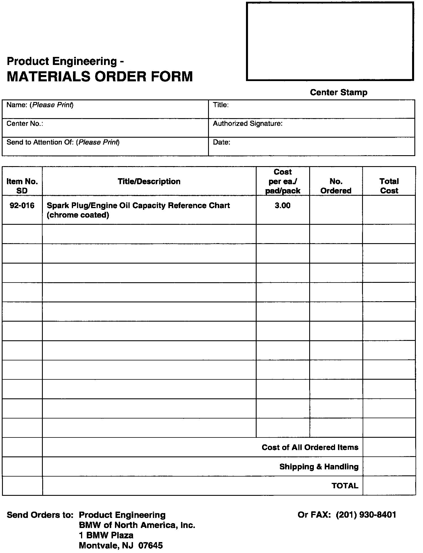 MATERIALS ORDER FORM