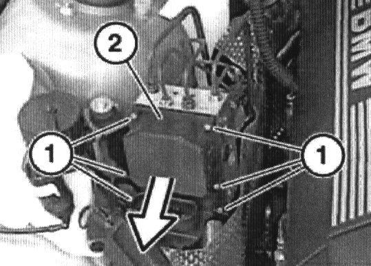 Housing edge of control module (1) must slide over extension on hydraulic unit (2).