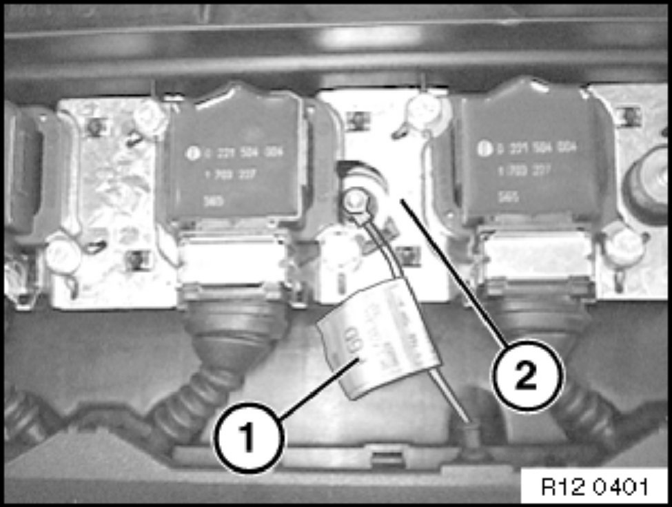 Screw down grounding strap (1) of cable duct with connecting plate (2) of ignition coils.