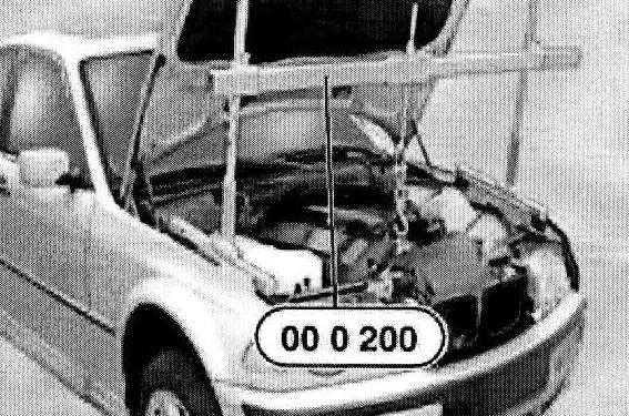 Secure special tool 00 0 200 to front suspension eye on engine.