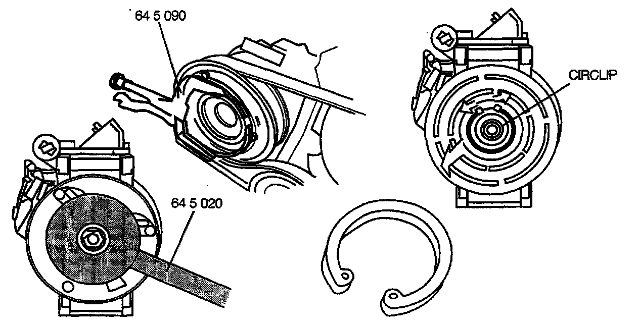 Grip the drive plate with special tool 64 5 090 (for the Nippondenso compressor) or special tool 64 5 020 (for the Seiko Seiki), unfasten the screw, and remove the drive plate.