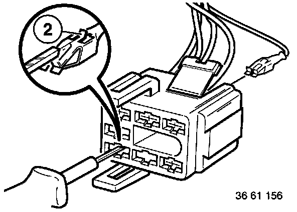 With special tool 61 1 136 or 61 1 137 (ejector), press back arrester hook (2) of appropriate contact and pull out cable.