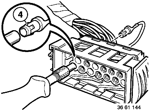 - With special tool 61 1 132 (ejector), press back arrester hook (4) of appropriate contact and pull out cable.