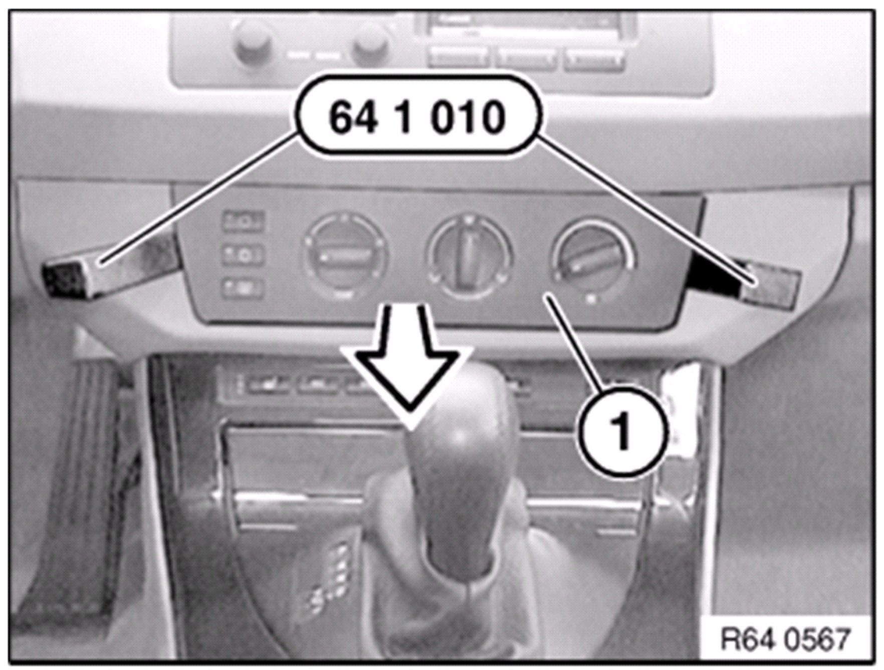 Unlock heating controls ( 1 ) with special tools 64 1 010 and pull out in direction of arrow.