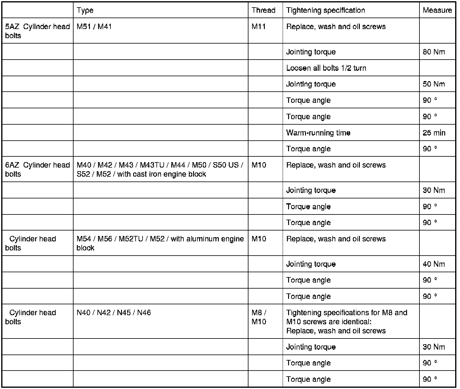 Cylinder head bolt torque specification, all M50/52/52TU/54/56, Aluminum and Iron block