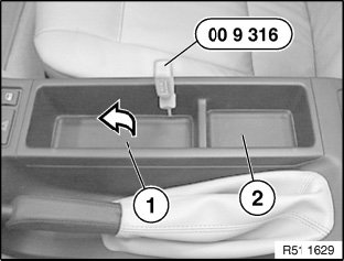 Guide (2) must be positioned between supports (3) of center console (4), insert (1) can now be snapped towards bottom into place.