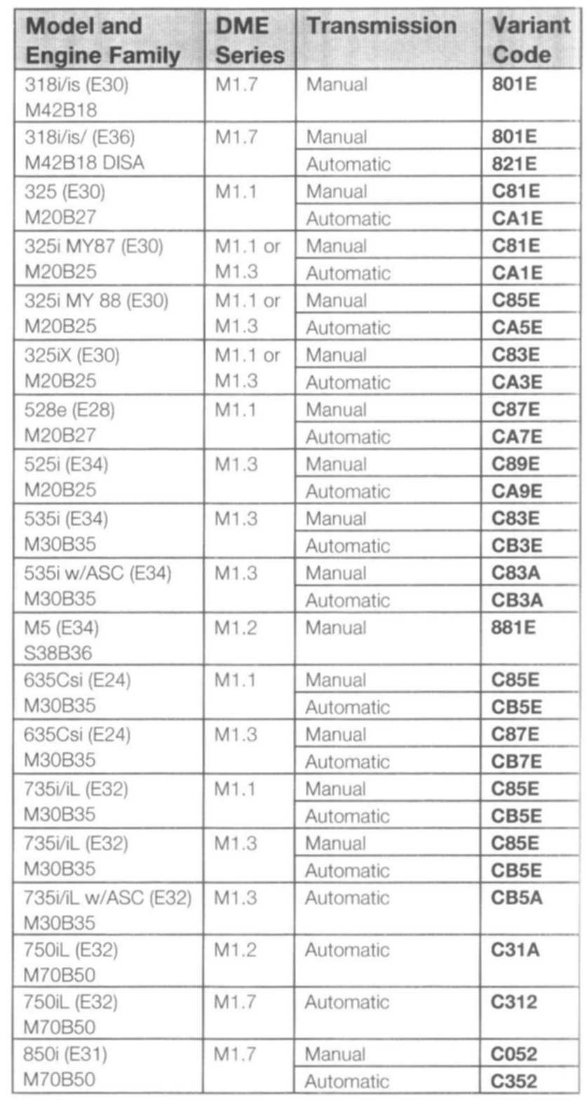 The provided table provides a list of all the DME Variant Codes for U.S. vehicles.