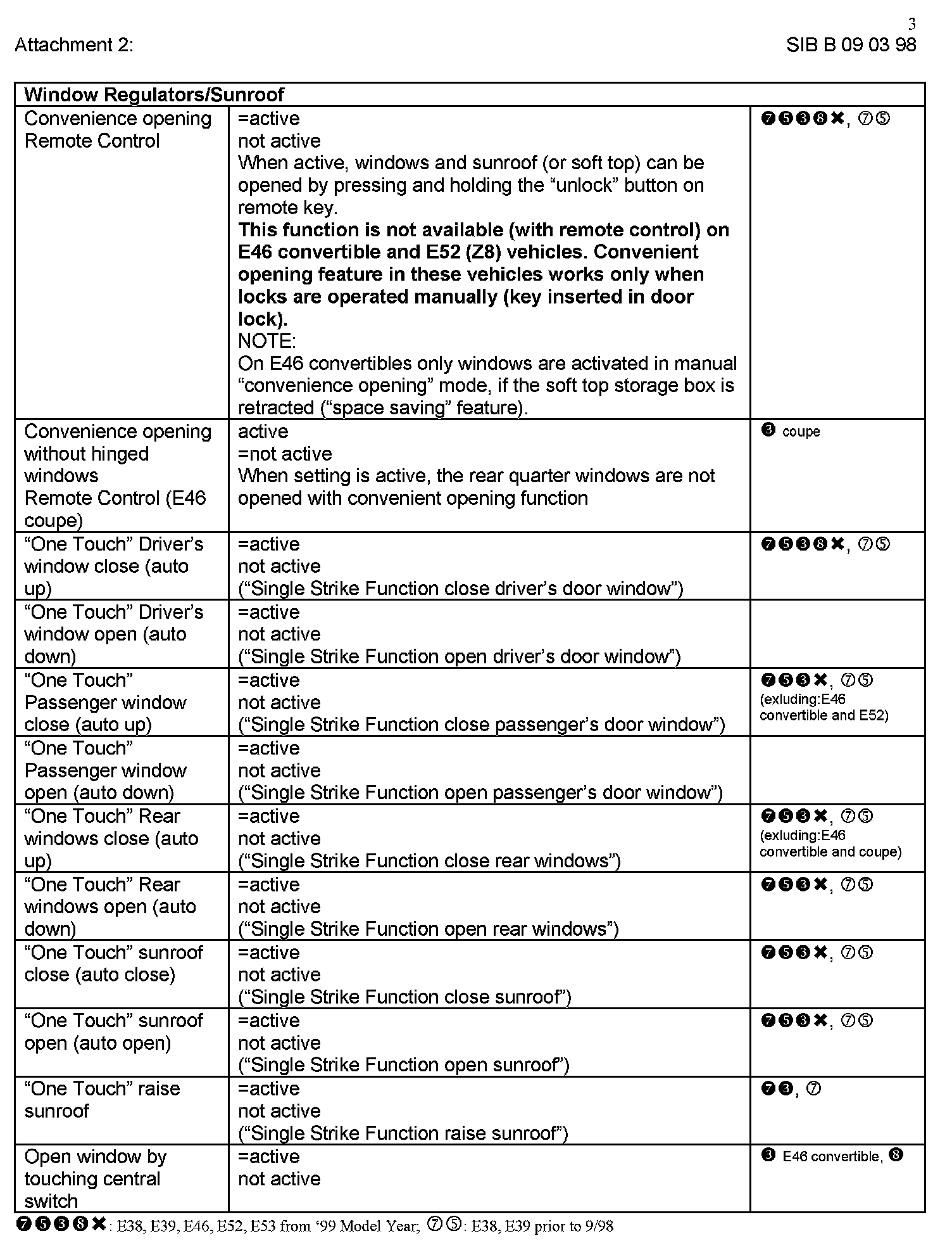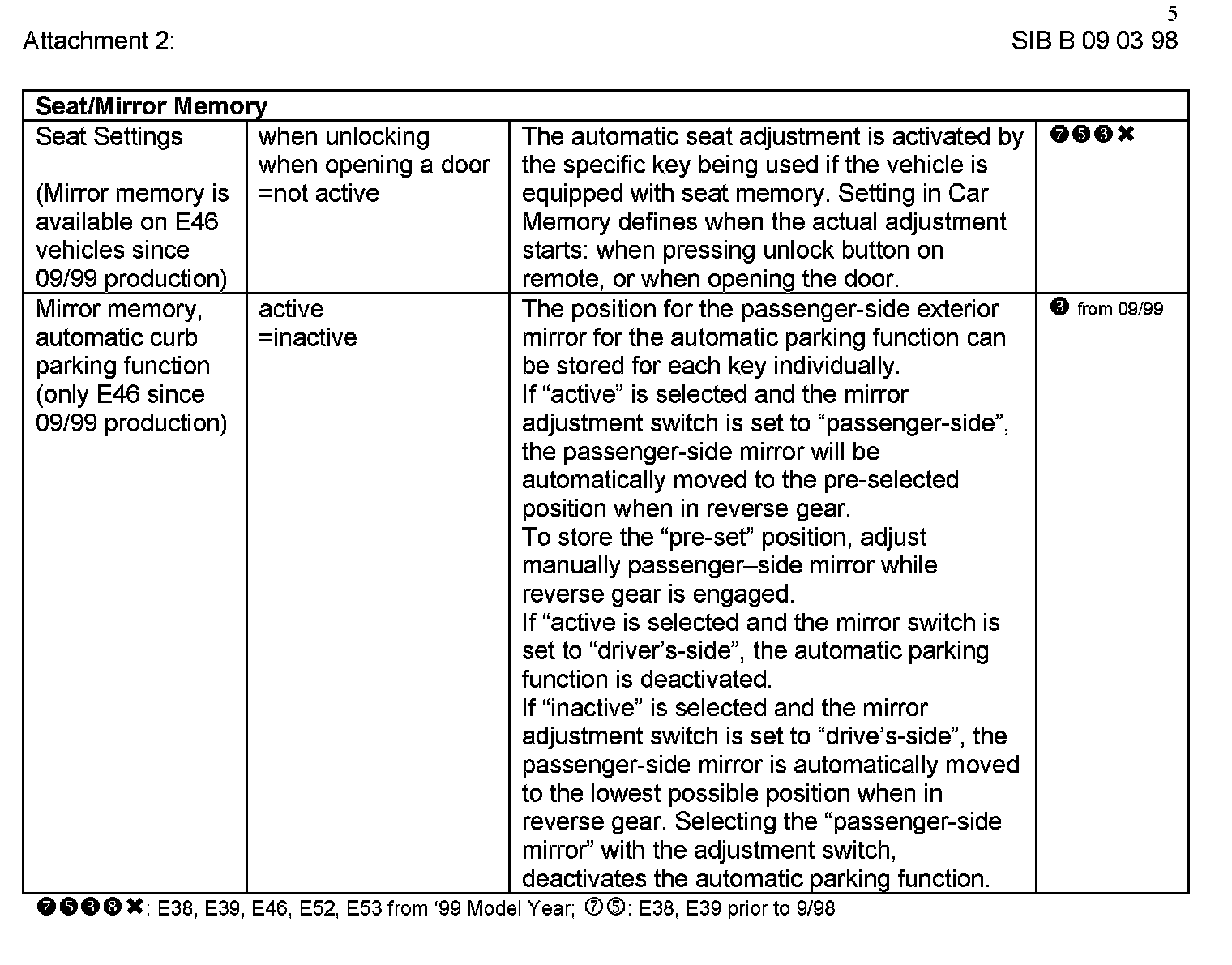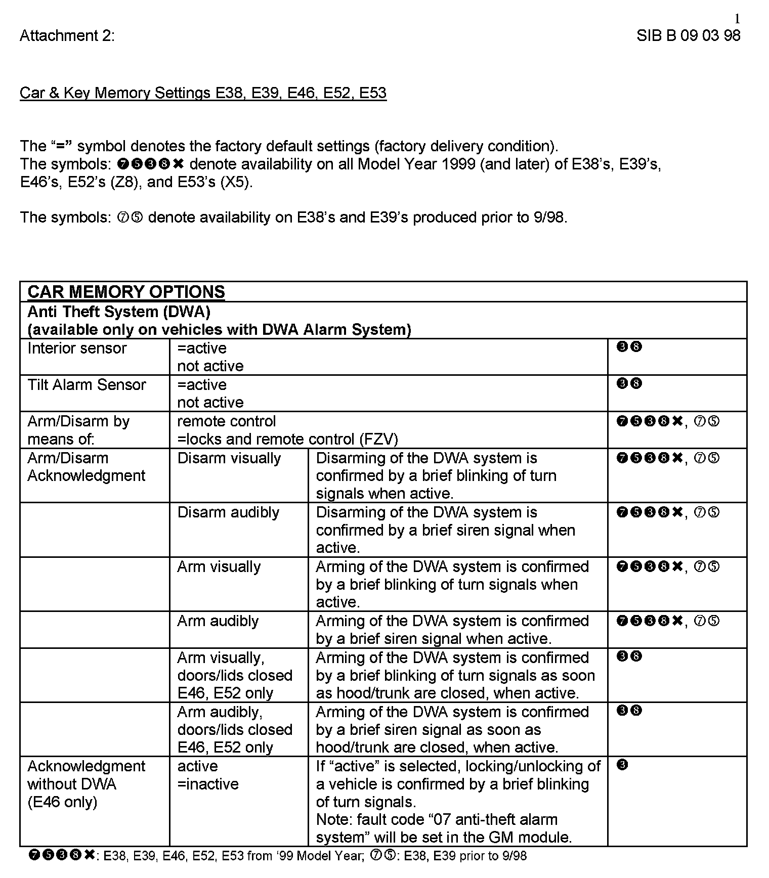 Attachment "B090398_Att2_CKMSet" itemizes all available "Car and Key Memory" options for the E38, E39, E46, E53, and E52 vehicles.