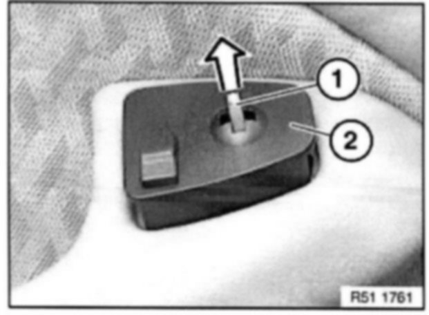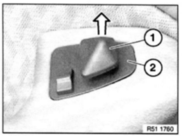 Using pointed pliers on rod (1), pull up mirror adjustment switch (2) as far as shown in illustration and lift out completely by hand.