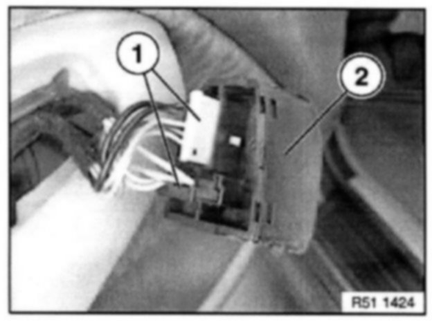 Disconnect plug-in connections (1) and remove mirror adjustment switch (2).
