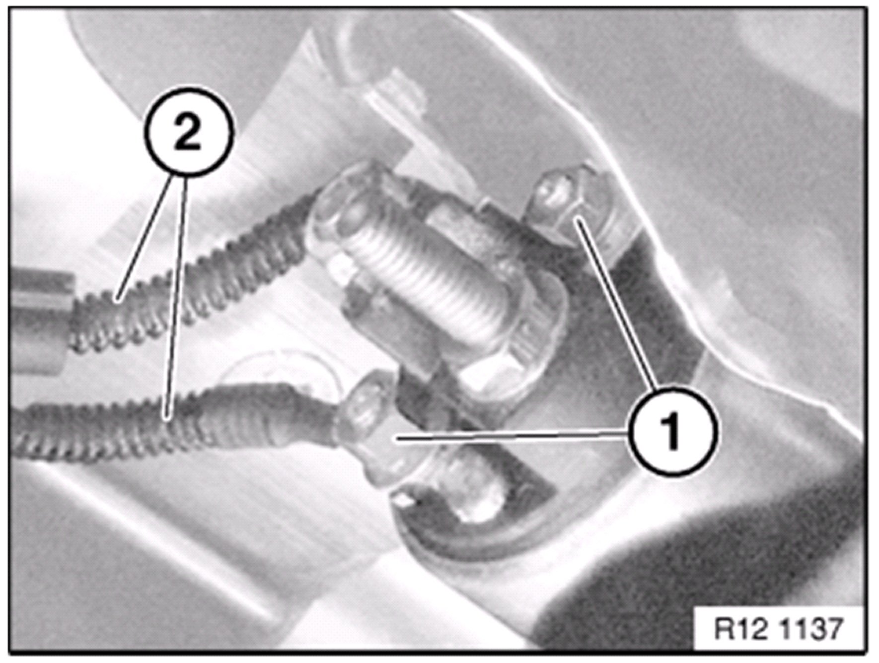 Loosen both starter motor mounting bolts ( 1 ) on transmission: