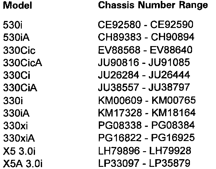This Service Action involves E39, E46, and E53 X5 vehicles with M54B30 engines, which were produced from 11/2001 to 12/2001.