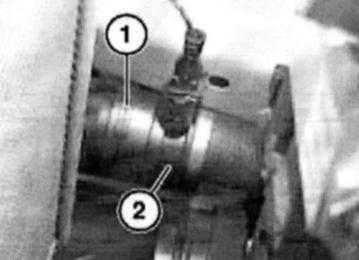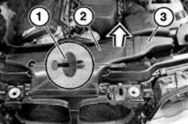 Pull retaining clip (1) upwards and detach coolant hose (2) from radiator.