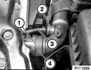 Pull retaining clips (1) and (2) upwards and detach coolant hoses (3) and (4) from radiator.