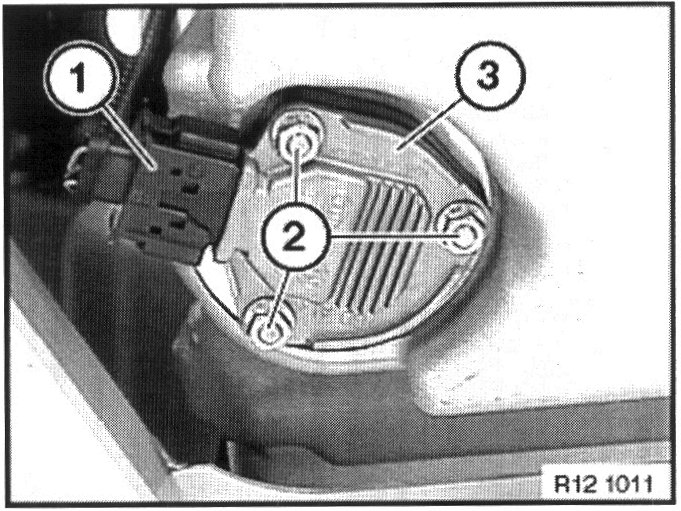 Ensure the engine is warm. Loosen oil filter cover to allow engine oil to drain into oil pan. Raise vehicle on hoist. Remove any underbody paneling or reinforcement as necessary to gain access to the sensor. Drain the oil. Disconnect the plug connection (1) and unscrew the three nuts (2) fastening the sensor to the oil pan. Clean the sealing surface of the oil pan in the location of the sensor. Replace the sensor and gasket ring with new parts. Reinstall the underbody paneling or reinforcement and lower vehicle. Tighten the oil filter housing cover and refill crankcase to proper level with new oil. Do not reuse the original oil!