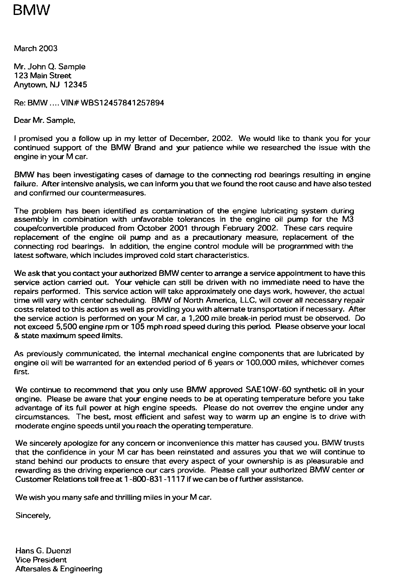 [NEW] Service Action was initiated on those vehicles to replace the engine oil pump, and as a precautionary measure, to replace the connecting rod bearings. Additionally, the engine control module will be programmed with the latest software, which includes improved cold start characteristics. Customers were notified of this Service Action through mailing campaign, initiated at the beginning of April 2003. Service Information B11 02 03 contains a detailed repair instruction as well as all warranty information.