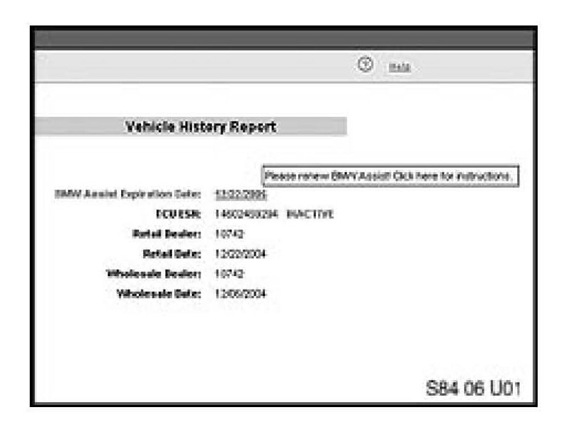 1. Check the BMW Assist account status on DCSnet. The BMW Assist services expiration date and TCU activation status can be checked on DCSnet under Service/Vehicle History Inquiry. Refer to SI B02 01 06 (Updated DCSnet Vehicle History Inquiry information of BMW Assist) for more information.