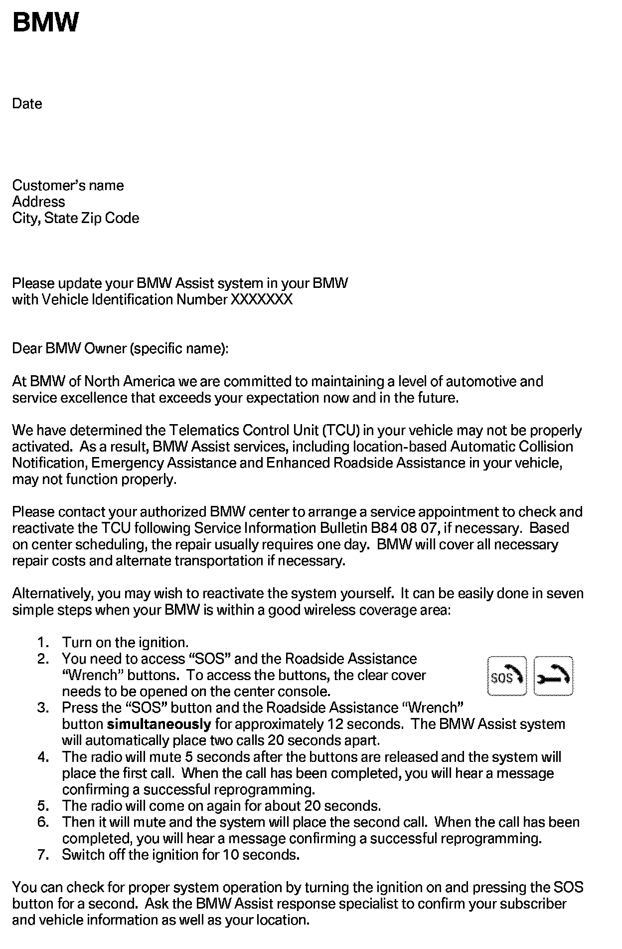 The replacement Telematics Control Unit (TCU) in the vehicle may not have been properly activated. This may cause the manual and automatic emergency call and roadside call (BMW Assisttrade;) not to function. This Service Action reactivates the TCU by assigning a new Mobile Identification Number (MIN) and Mobile Device Number (MDN) to the TCU.
