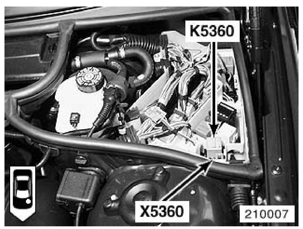Disconnect the battery. Remove the cover from the E-box in the engine compartment. Disconnect the connectors from the control modules. Remove the hydraulic control unit relay (K5360) and unlatch the relay connector (X5360) from the control module carrier assembly.