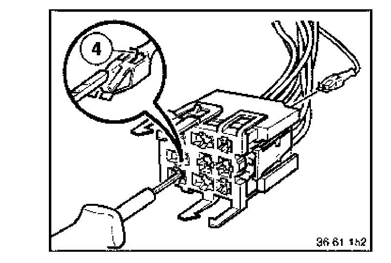 [NEW] Using connector extractor 61 1 136 located in extractor kit # 61 1 150, carefully release the hooks (4) from the red terminal 87 wire from slot 2 of the relay connector and the red/yellow terminal 30 wire from slot 6. Swap wire positions by relocating the red terminal 87 wire into slot 6 and the red/yellow terminal 30 wire into slot 2.