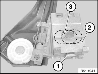 Disconnect plug connection (1) from power window motor (2) (risk of trapping).