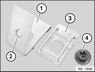 - Slide shim (1) and clamping plate (2) onto door window glass, press together until all catches (2) snap into place in bore.