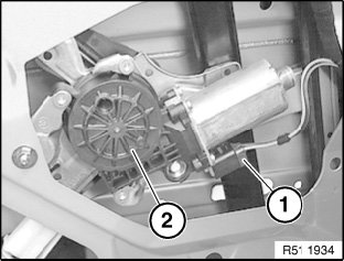 IMPORTANT: Disconnect plug connection (1) from power window motor (2) (risk of trapping).