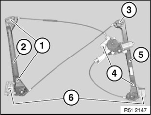- Insert nuts (3 and 4) of front power window unit rail (5) but do not tighten down