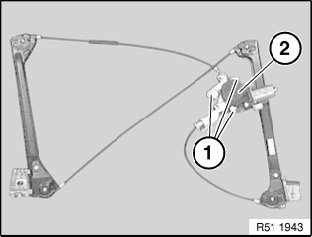 - Tighten down nuts (1) on rear power window unit rail (2)