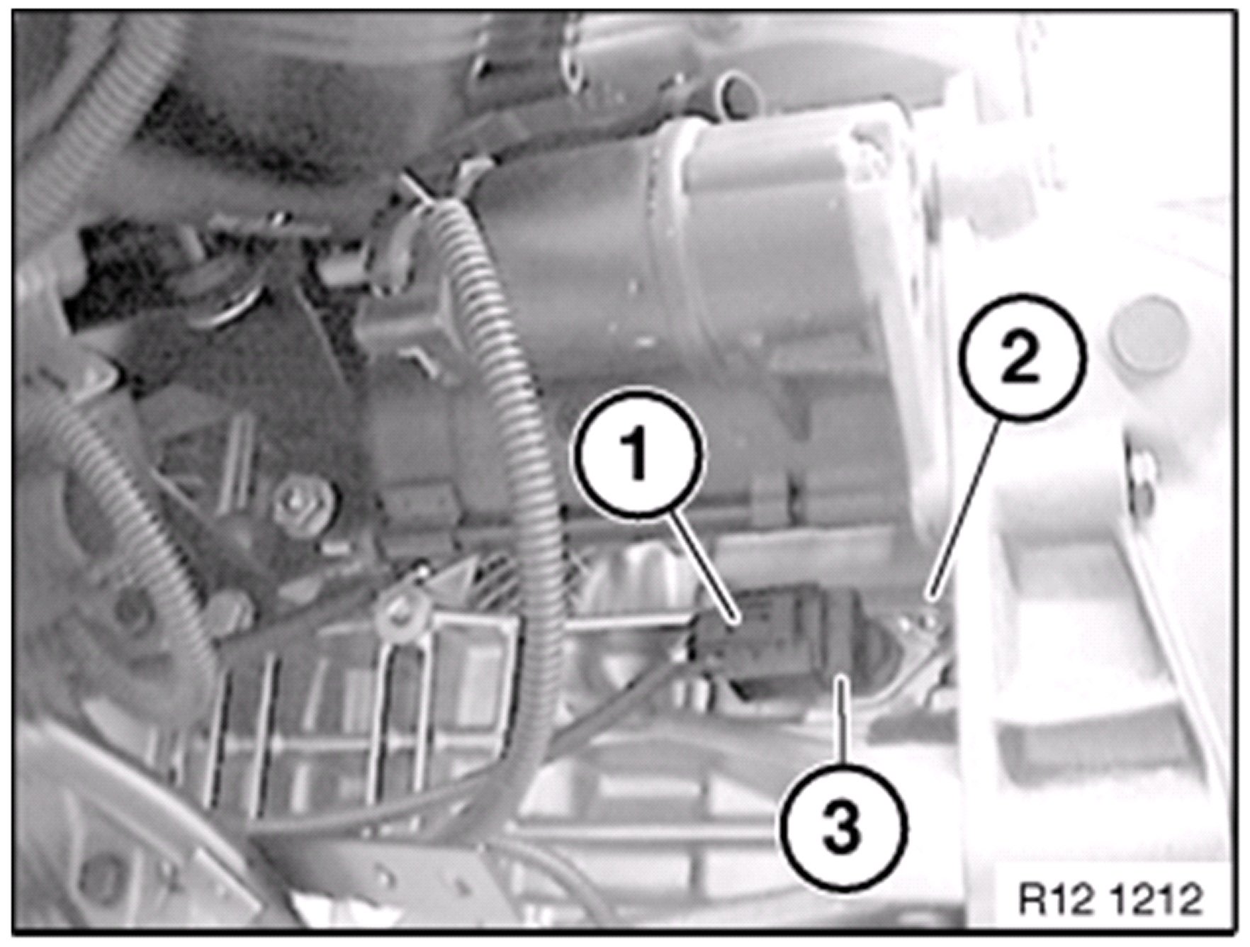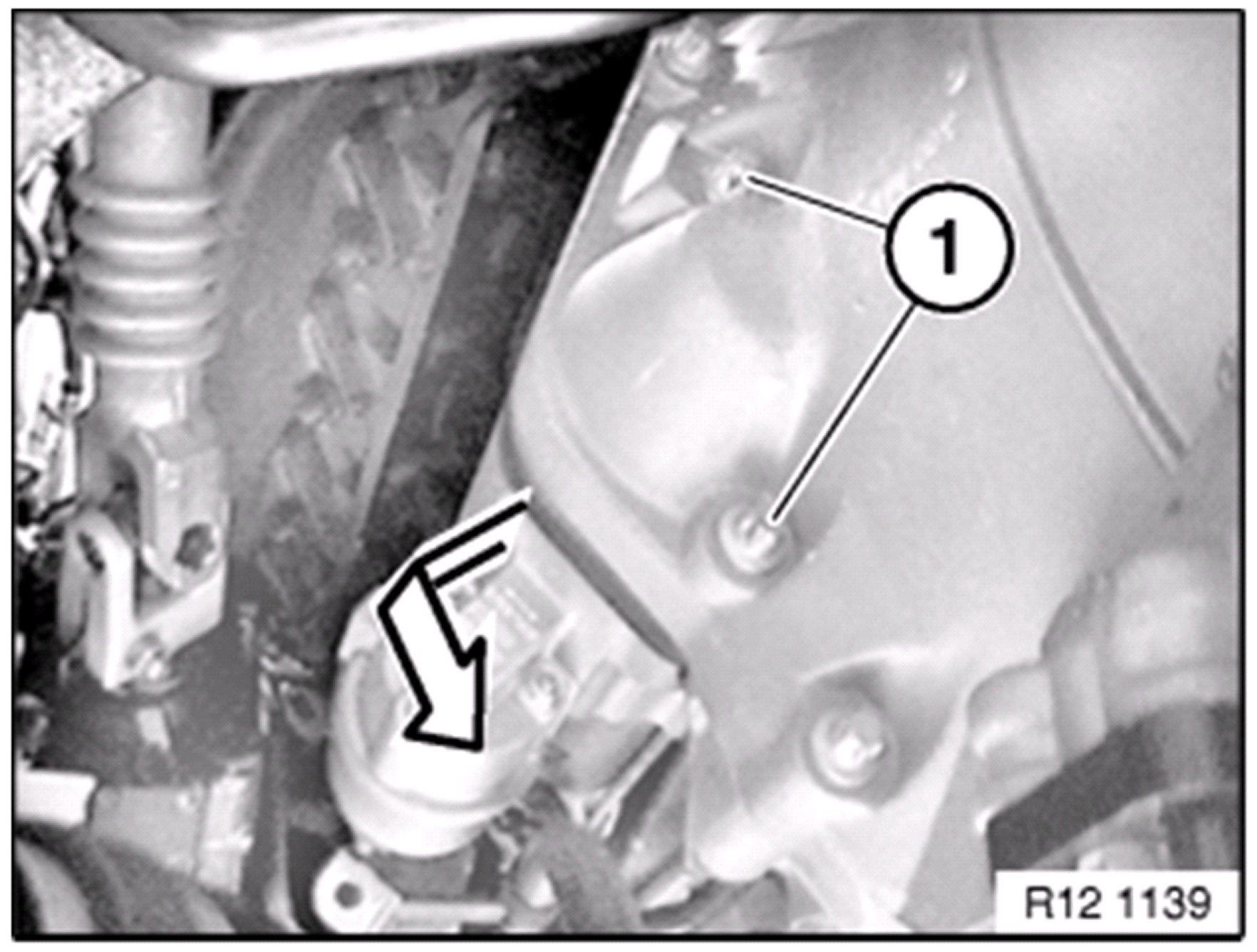 Loosen both starter motor mounting bolts ( 1 ) on transmission:
