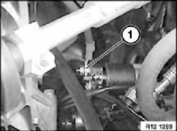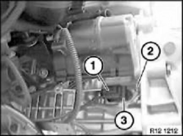 Release both starter motor mounting bolts (1) on transmission: