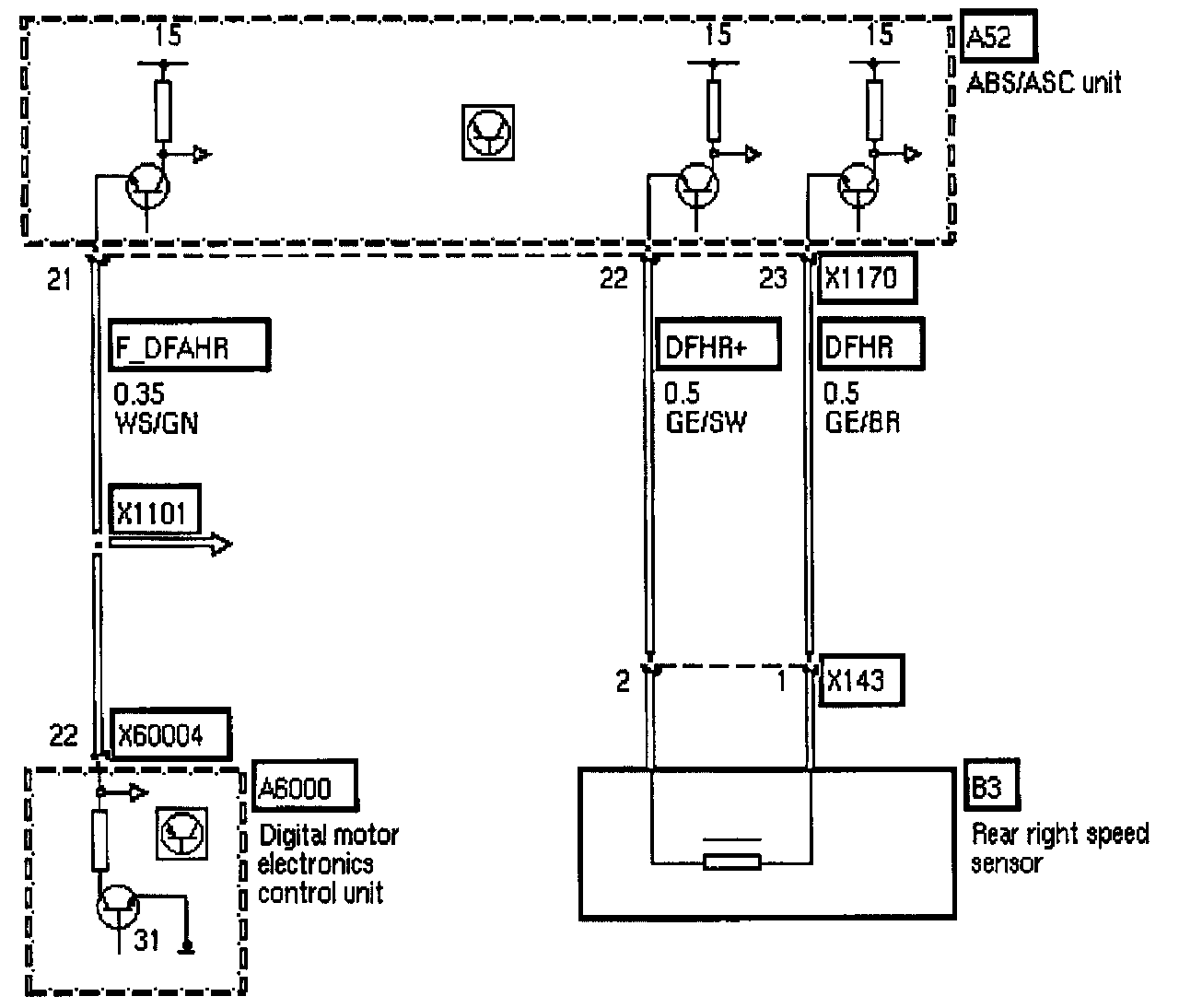 The vehicle speed signal to the ECM is provided by the ABS/ASC control module (square wave signal) from the right rear wheel speed sensor (Hall effect). The speed input is required by the ECM for vehicle speed limiting, idle speed regulation, and emergency operation.