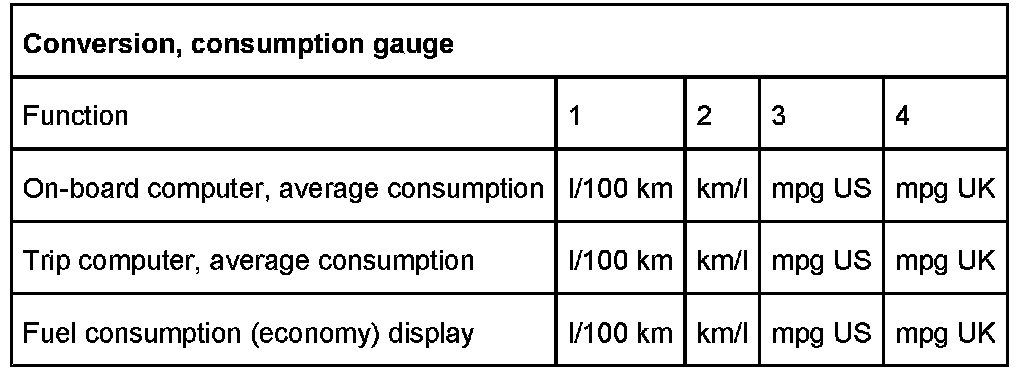 - Consumption in mpg US, mpg UK, km/l, l/100 km