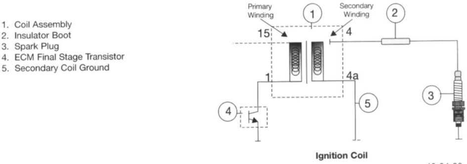 The primary winding receives battery voltage from the Ignition Coil Relay (in the IVM) which is activated by the CAS Module. The ECM provides a ground path for the primary coil (Coil Terminal 1) by activating a Final Stage transistor. The length of time that current flows through the primary winding is the "dwell" which allows the coil to "saturate" or build up a magnetic field. After this storage process, the ECM will interrupt the primary circuit at the point of ignition by deactivating the Final Stage transistor. The magnetic field built up within the primary winding collapses and induces the ignition voltage in the secondary winding.