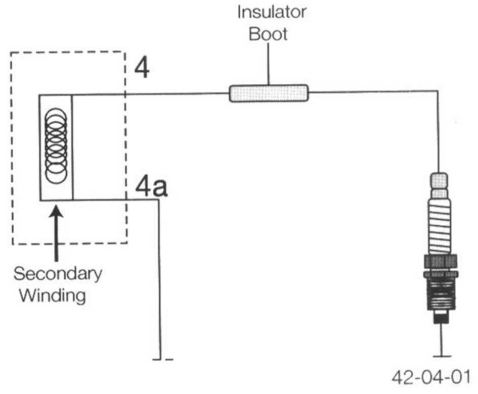 The high voltage generated in the secondary winding is discharged through Coil Terminal 4 to the spark plug (insulated by the boot connector).