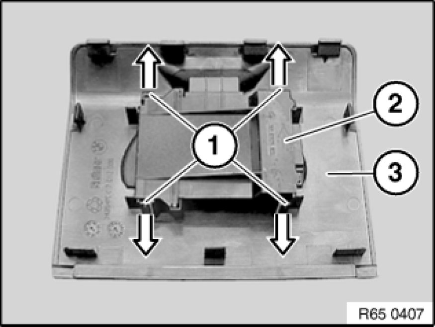 - Remove make-up mirror and front console insert 51 44 180 - Removing and installing / replacing rear console insert / make-up mirror in rear compartment.